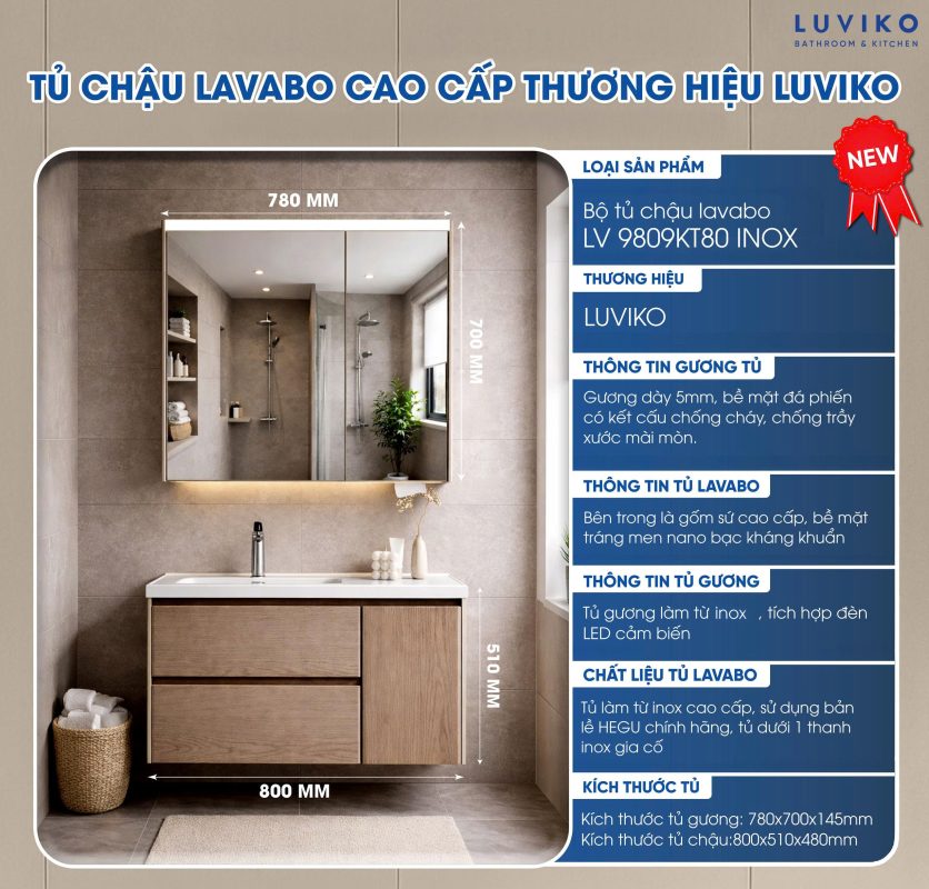 Bộ tủ chậu lavabo gương nhà tắm LUVIKO LV 9809KT80 INOX